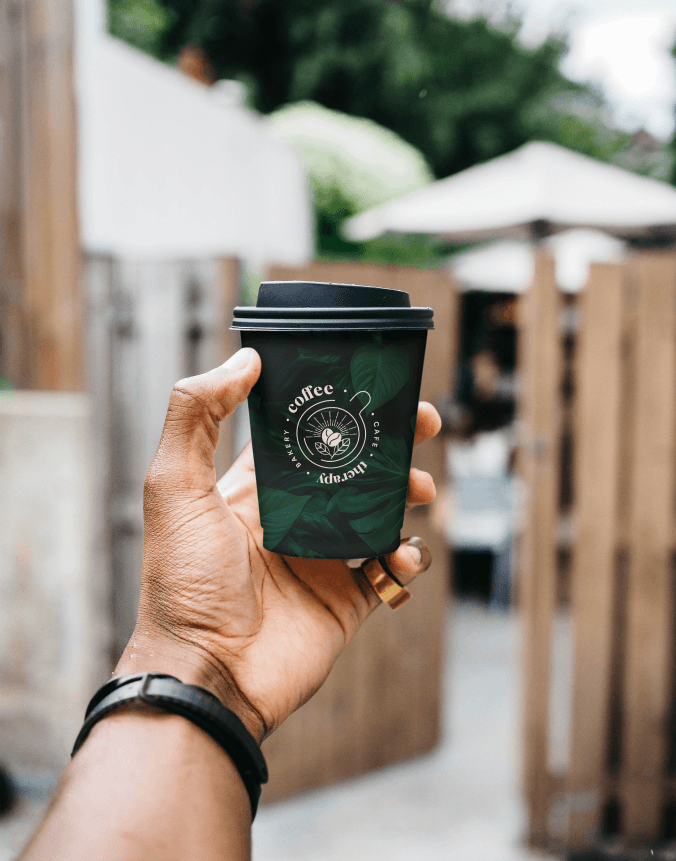 Packaging Design: Branded paper cups, takeaway sleeves, stickers, and bakery packaging